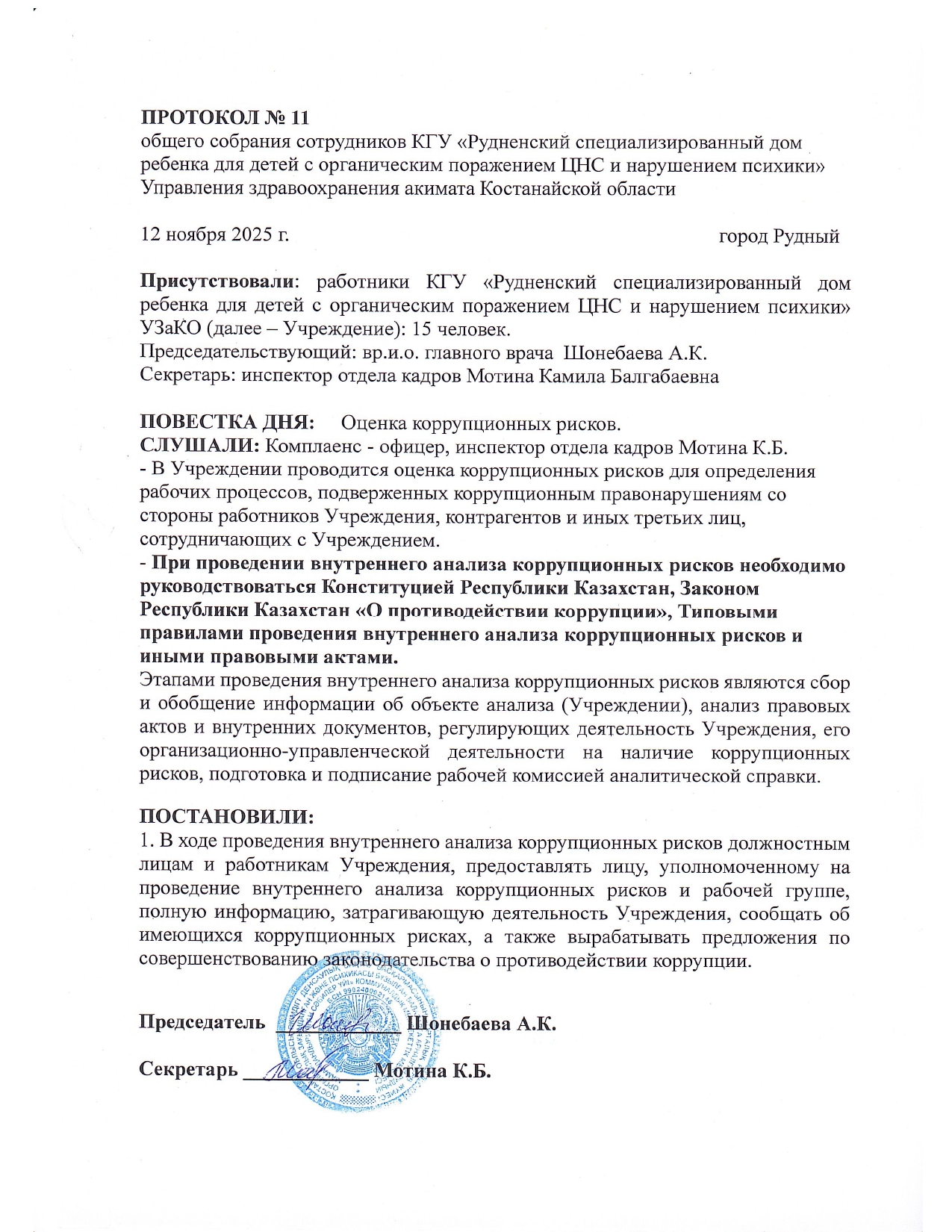 Протокол №11 общего собрания сотрудников КГУ "Рудненский специализированный дом ребенка для детей с органическим поражением ЦНС и нарушением психики" УЗАКО